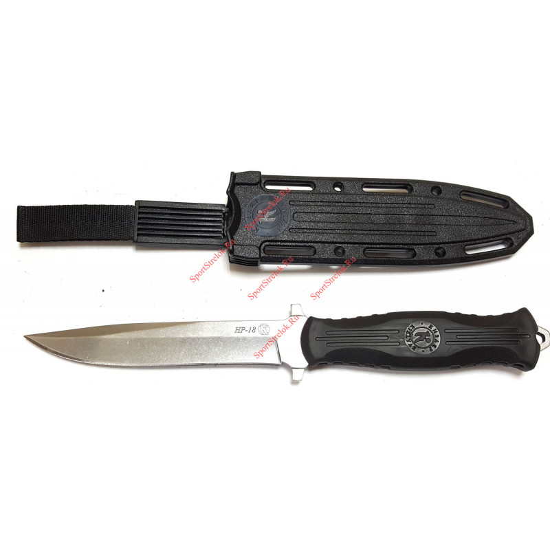 НР-18 современная интерпретация легендарного ножа разведчика 40-х годов. К классической форме клинка, неоднократно проверенной временем, была добавлена симметричная рукоять из эластрона, что позволило повысить удобство удержания и позволило сделать работу с ножом комфортной и уверенной при любом хвате. Чехол получил кардинальные изменения, по сравнению со своим предшественником. Теперь нож имеет современную одежку из ударопрочного АБС пластика, с возможностью фиксации при помощи различных крепежных систем. Сталь на клинке используется серийная AUS-8 c твердостью клинка 58-59 HRC. Она весьма неприхотлива, легко точится, не ржавеет и имеет хорошую прочность на излом.